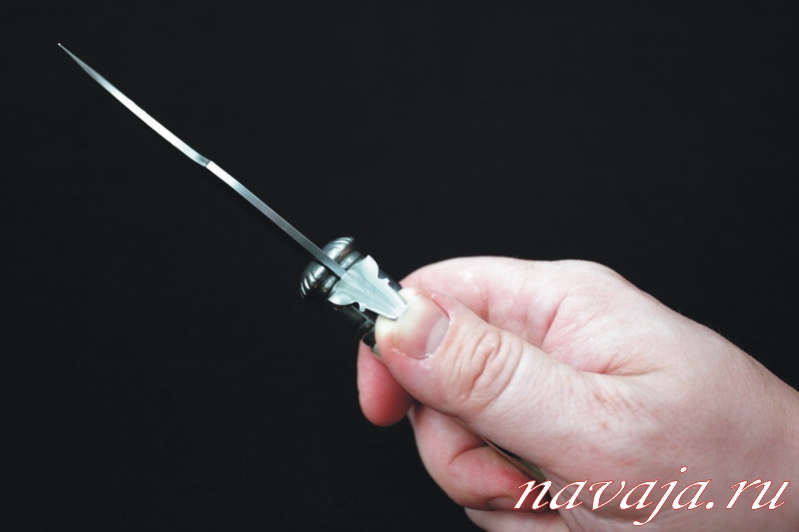 Чтобы открыть нож, потребуется никак не меньше двух рук - тугая пружина надёжно держит клин. А вот закрыть нож можно и одной рукой - замок легко отжимается специальной штуковиной.